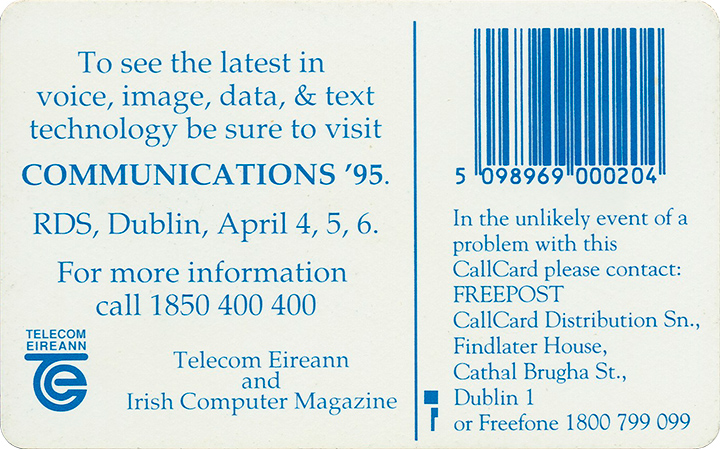 Callcard issued for the Communications '95 Exibition and Converence at the RDS Dublin