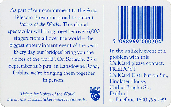 Callcard used to promote the Voices of the World Choral Extravaganza, to which Telecom Eireann sponsored. It was held at Lansdowne Road, Dublin on the 23rd of September 1995. Over 6,00 singers took part.