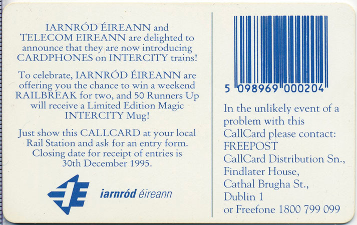 Callcard promoting a joint venture by Telecom Eirean and Iarnrod Eireann to announce the use of Cardphones on Intercity Trains.