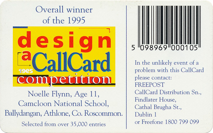 Winning illustration of the third nationwide Design a Callcard schools competition was won by Noelle Flynn, age 11, Camcloon National School, Ballydangan near Athlone. The popular competition for primary and post primary school students attracted over 35,000 entries in 1995 (previously 27,000 entries in 1994/95).