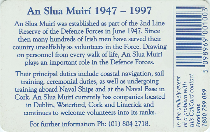 This CallCard was released in 1997 to mark the 50th Anniversary of an Slua Muirí, the 2nd line reserve of the Irish Defense Forces.