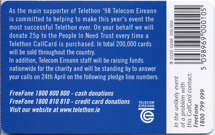 Callcard issued for People in Need Telethon 1998, a nationwide event that took place on the 24th of April 1998, in order to raise funds for various charities. The event was sponsored by Telecom Eireann and broadcasted live on RTE Television.
