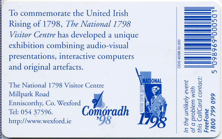 Callcard issued for the bicentenary commemoration of the United Irish Rising of 1798 and to promote the 1798 Visitor Centre in Enniscorthy, Co. Wexford.
