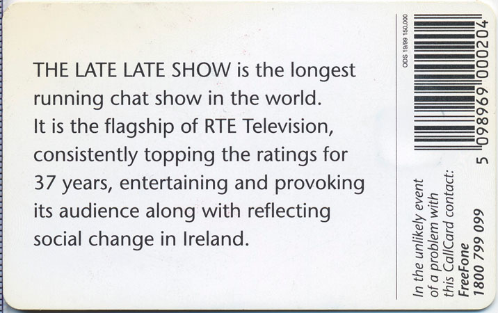 Callcard issued marking the last ever "The Late Late Show" with Gay Byrne as the presenter. Approximately 200 members of the final show received a special edition sleeve with both the Late Late show Callcard and a 100 Unit Economy Callcard (1143). In 'Gaybo's' own words "one for everybody in the audience"!