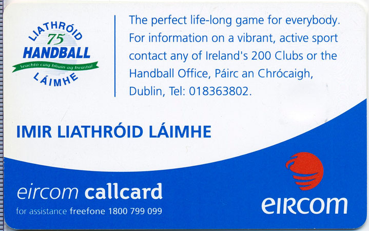 This Callcard was issued to celebrate 75 years of Handball in Ireland and to promote Ireland's 200 Handball clubs (as of 1999).