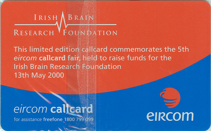 The fifth Eircom Callcard Collectors Fair was held in the R.D.S. Concert & Lecture Hall in Dublin on May 13th, 2000. The fair, hosted by Eircom and the Irish Brain Research Foundation, seen all proceeds being donated to the worthwhile charity. The fair started at 10am until 6pm. Entrance fee was EUR2.54 per adult and EUR1.27 per child (under 12). Eircom has been involved with the Irish Brain Research Foundation through the Callcard fair since its first in 1995.