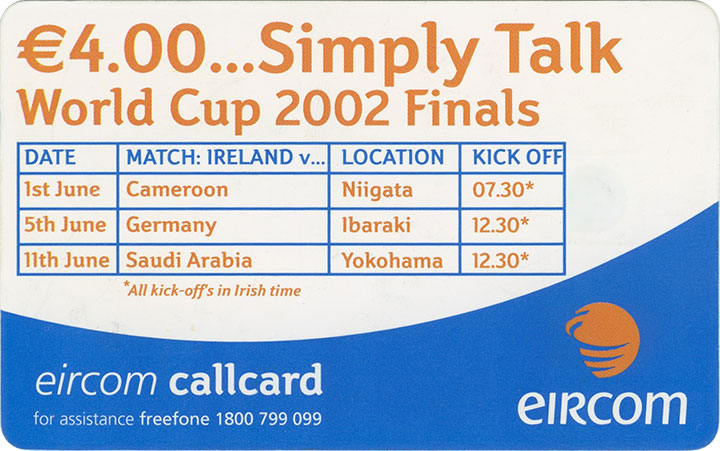 This Callcard was available as part of a set of 26 world cup 2002 Callcards. A commemorative cardboard folder was also available, which was available by post for €5.