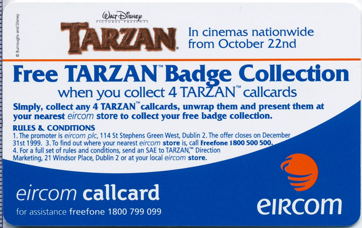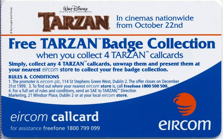 A unique promotion was developed to launch these Callcards. Customers who collected any 4 promotional Tarzan Callcards received a free Tarzan Badge set which was instantly redeemable at all eircom stores until 31 December 1999.